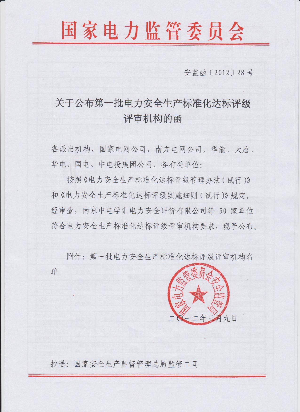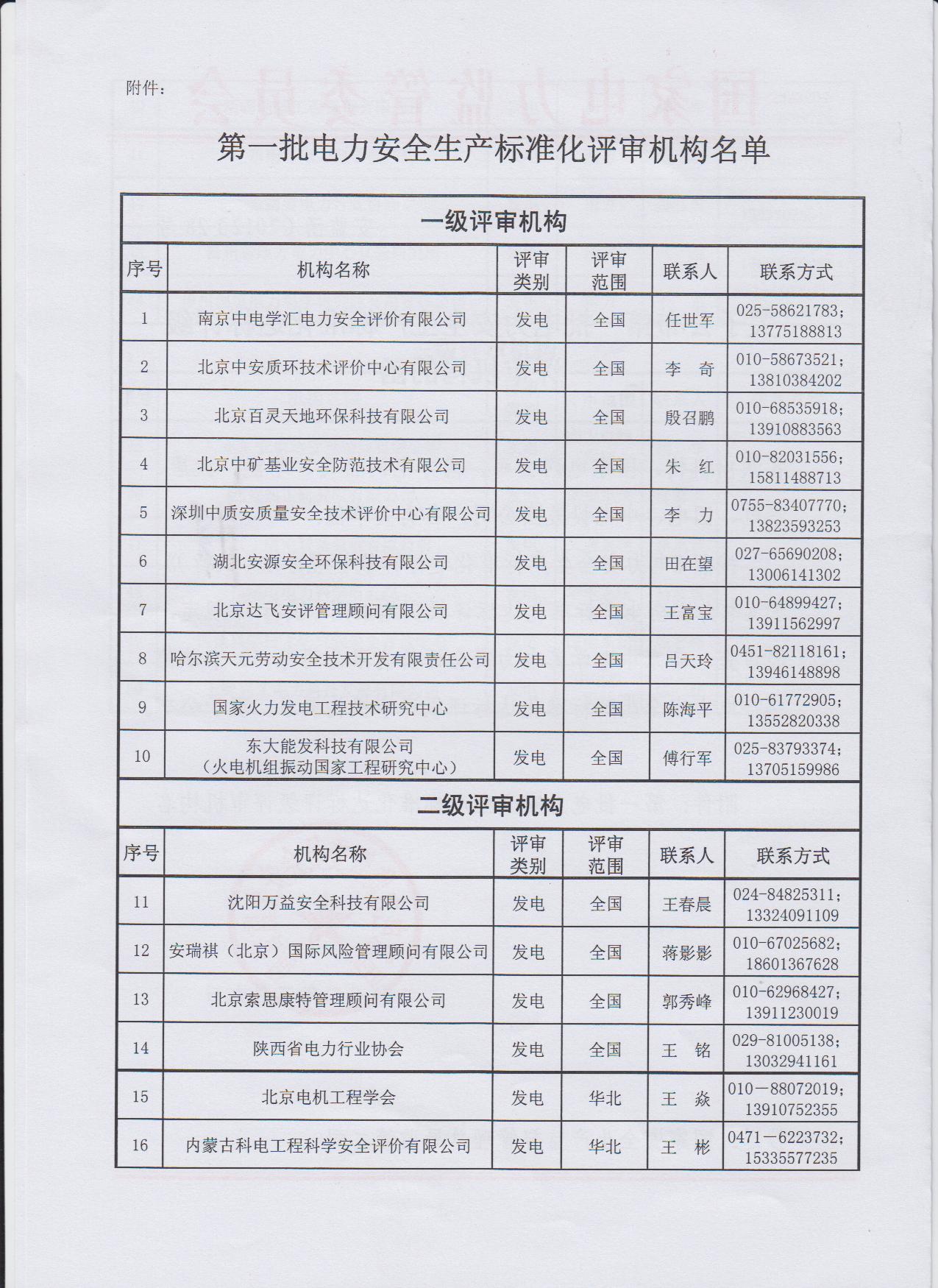 電力企業(yè)安全生產(chǎn)標(biāo)準(zhǔn)化達(dá)標(biāo)評級評審機(jī)構(gòu)(一級)